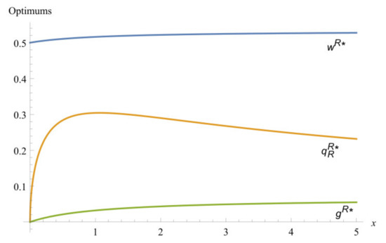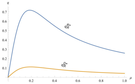 Interestingly, we find that is non-monotone in in the support of a given . When the technology level is increasing, the retailer first tends to increase her input quantity of green production through a stronger green-marketing effort. However, the downstream market potential is limited; therefore, when the quantity of the green product that is available on the market increases, the market retail price will decrease accordingly, as shown by the inverse demand function. Hence, when the quantity of the green product in the end-user market reaches a threshold, the retailer will reduce the input quantity. Therefore, to generate more profit from the downstream market, we observe a unimodal in , even if is further increasing in . We illustrate the above results in Figure 3.