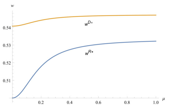 Different from online sales channels, the retailer can invest in green marketing to promote the green product. Therefore, to capture the green promotion effort distinction between the green products from the retailer and the competitive supplier, we assume that the inverse demand function for the retailer’s product is , where represents the amount of the potential growth driven by the green-marketing effect for the product [15,56]. A stronger green promotion effort exerted by the retailer implies a higher cost. We denote the green-marketing cost as a quadratic function (i.e., ) [56,57,58]. The value of parameter is called the “customer acceptance” of the online channel. An empirical study shows that buyers tend to prefer to shop at a retailer rather than to shop via the web-based direct channels [59]. Another survey provides further evidence that most products are more acceptable to consumers when they are in conventional retail stores, rather than listed on an online channel [54]. Therefore, we assume in this paper, in line with Chiang et al. [54], which represents that the number of products sold online has a weaker impact on the price of green products for the retailer.