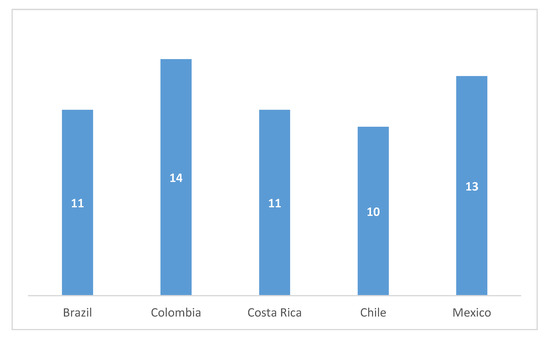 The distribution of the pilot courses by country gives us the following information: 14 pilot courses were planned to be developed in Colombia, followed by Mexico with 13, Costa Rica and Brazil with 11, and Chile ending the list with 10 (see Figure 1 shown below).