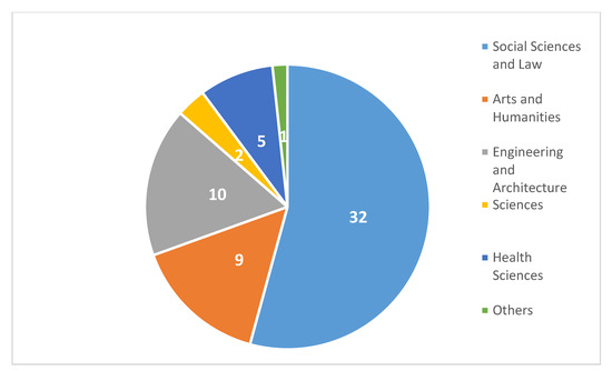 Regarding the field of knowledge of those pilot courses, Figure 2 shown above presents the following data: the largest number of pilot courses fell within the knowledge area of Social Sciences and Law, with a total of 32 in this category. Far behind were the other subject areas as follows: 10 pilot courses belonging to the field of knowledge of Engineering and Architecture, 9 to Arts and Humanities, and 5 to Health Sciences; closing this classification were the only two courses belonging to the area of Science. It is important to note that one of the courses belonged to a non-specific category.