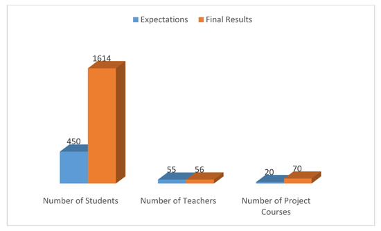 However, according to the external evaluation carried out by the Columbus Association, the 10 Latin American HEIs implemented a total of seventy pilot SI courses, mainly at the undergraduate level. Thus, the project has exceeded the quantitative objectives set at the beginning of the project [34]. Three facts corroborate this statement (see Figure 3): (a) Regarding the number of pilot courses: at the beginning, the project aimed to carry out 20 courses (two per institution); subsequently, after the training course held in April 2018 in Porto Alegre, 59 were identified but 70 courses were finally implemented. (b) Regarding teachers’ participation: at the beginning of the project, it was expected that 55 teachers would participate in the project; 56 teachers finally took part in the pilot-courses. (c) Regarding the students: S4C aimed to develop SI competences in at least 450 students from the participating HEIs. The final figure greatly surpassed expectations, with more than 1614 students participating in the different pilot courses.