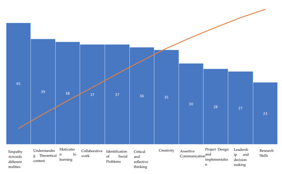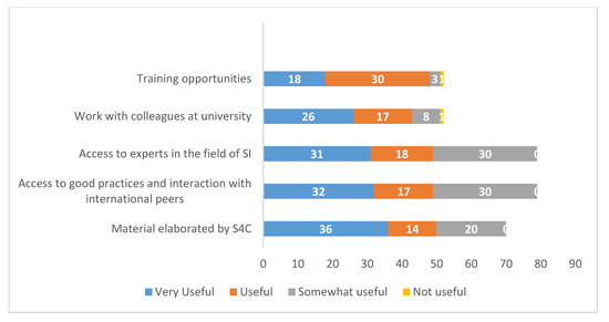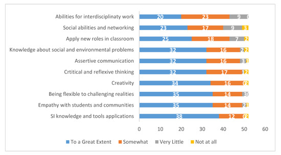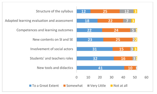 Taking into account special context features, red tape in universities, and aversion to change, we found that adaptation of the syllabus was one of the main challenges of the project. However, more than half of respondent teachers (37 out of 52) to the survey declared that they could adapt the syllabus to a certain or great extent [34]. Specifically, they stated that they incorporated new tools and didactics into the respective academic syllabuses (51), applied new roles in the class (48), and developed a closer relationship with social actors (46) (see Figure 5 below). The S4C project has demonstrated how students and lecturers can work together in the field of SI.