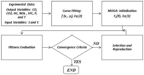 The main objective of the current research is to enhance the performance of the engine (SFC minimization, maximization of P and T) and the reduction of emissions (minimization of CO, CO2, HC, and NOx). A Multi-objective Genetic Algorithm (MOGA) comprising of two inputs and seven objectives was used. For this purpose, input variables for the search space were S (rpm) varied in the range of (1600 2000) and E (%) varied in the range of (0–12). The objective functions were surfaces obtained from fitting three-degree polynomials when output variables were a function of S and E; these output variables were CO (%), CO2 (%), HC (ppm), NOx (ppm), SFC 9 g/kW·h), P (kW), and T (N·m). To achieve the global minimum or the Pareto solution for all objectives, all objective functions would need to be a minimization problem. To do this, the reverse values of P and T (1/P and 1/T) were used, but the results were reported as P and T. The general form of the objective function is presented in Equation (1) shown below: