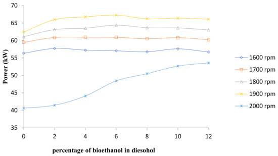 Figure 3, Figure 4 and Figure 5, respectively, display the engine power, torque, and specific fuel consumption (SFC) test results using diesel–ethanol fuel blends and conventional diesel. Figure 3 shows the average engine power at all speeds.