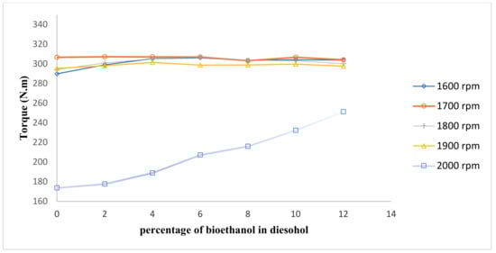 The finding showed that the maximum power and torque of diesel–ethanol fuel blends is 67.26 kW at 1900 rpm and 307.17 N·m at 1700 rpm, respectively. The engine torque and power show a slight rise when bioethanol percentage is increased; this is because of good combustion of ethanol due to the high oxygen content, which could improve combustion [19,20,21,22]. The molecular formula of ethanol is C2H5OH, which is an oxygenated hydrocarbon. It indicates that it contains oxygen, which results in improving combustion.