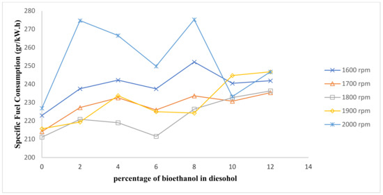 Due to the lower calorific value of bioethanol relative to conventional diesel fuel, the specific fuel consumption increases with an increase of bioethanol in diesel–ethanol fuel blends in comparison with net diesel fuel [23]. More fuel volume reaches the combustion chamber and induces an increased rate of specific fuel consumption when diesel–ethanol fuel blends are used [24].