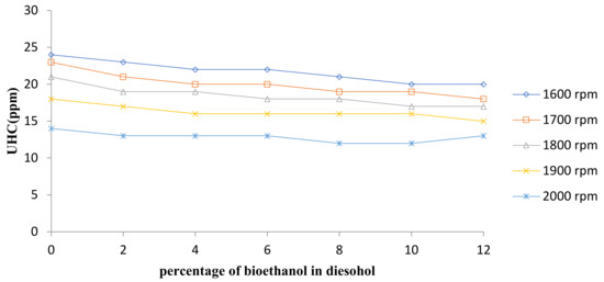 The curves illustrate that with an increase in the percentage of bioethanol in the blends, the HC concentration in the emission tends to reduce. The use of diesel–ethanol fuel blends in diesel engines results in more complete combustion and thereby decreases the concentration of UHC in the gas emission. This is because, in the molecular structure, the bioethanol consists of oxygen and accordingly needs fewer oxygen molecules to complete the combustion. Researchers have also reported some similar trends for diesel–ethanol blends [26,27,28].
