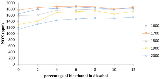 NOX emissions for the present research work are also shown in Figure 8 for diesel fuel and diesel–ethanol fuel blends and Figure 9 shows average changes in NOX concentration at all speeds. The formation of NOx strongly relies on the temperatures of the combustion chamber and the concentration of oxygen.