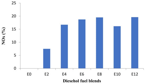 Increasing the percentage of bioethanol in diesel–ethanol fuel blends raises NOX emissions, as seen in Figure 8 and Figure 9. This increase was attributed to the high combustion quality in the combustion chamber, which resulted in a higher combustion chamber temperature [8]. It has also been documented in most previous research sources that NOX emissions increase through the use of ethanol–diesel blends [28,29,30].