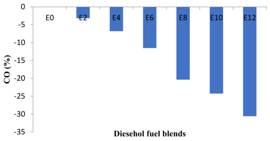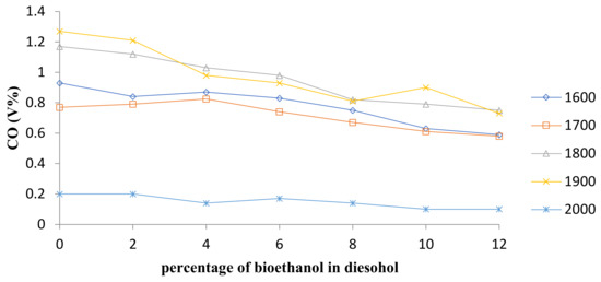The curves trend shows that when the percentage of bioethanol increases, the amount of CO decreases. The reason is because bioethanol contains oxygen in its molecular structure and they, therefore, require fewer oxygen molecules to complete the combustion [21]. Studies have shown that the percentage of CO concentration in the emissions is decreased as the percentage of bioethanol in the blends is increased [24,27,28,31,32,33]. This trend is caused by lower carbon content in bioethanol than in diesel fuel. Furthermore, ethanol–diesel fuel blends would help to increase the oxygen-to-fuel ratio in the fuel-rich region that causes complete combustion and would also reduce CO concentration.