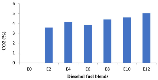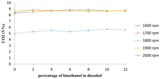 While Carbon Dioxide (CO2) emission released from combustion engine fuels is not a harmful agent for public health itself, it plays an important role in global climate change. Figure 11 and Figure 12 show that the increase in CO2 concentration is followed by the bioethanol percentage growth. The CO2 emission relies on the relative air–fuel ratio and CO emission concentration [20]. Increasing ethanol percentages causes lean burning, and consequently, the increase in CO2 emission due to the improved combustion [19,20,21,22].