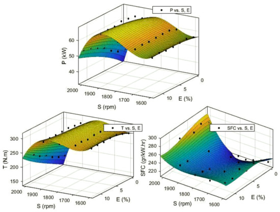 The objective function obtained from experimental data for engine power (P), Torque (T), and specific fuel consumption (SFC) as a function of engine speed (S) and Ethanol blend ratio (E).