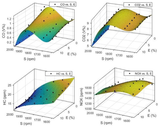 The objective function obtained from experimental data for engine emissions CO, CO2, HC, and NOx as a function of engine speed (S) and Ethanol blend ratio (E).