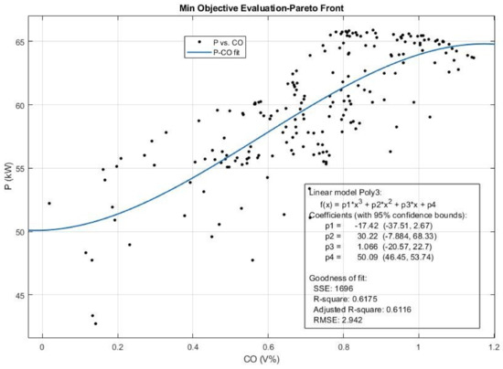 | CO emission, CO | p00 = 508.7 (434.6, 582.8) p10 = −0.8779 (−1.002, −0.754) p01 = 1.628 (0.5552, 2.7) p20 = 0.0005042 (0.0004353, 0.0005732) p11 = −0.001752 (−0.002926, −0.0005787) p02 = −0.01719 (−0.039, 0.004621) p30 = −9.619 × 10−8 (−1.09 × 10−7, −8.342 × 10−8) p21 = 4.636 × 10−7 (1.399 × 10−7, 7.874 × 10−7) p12 = 8.11 × 10−6 (−2.947 × 10−6, 1.917 × 10−5) p03 = 0.0001354 (−0.0003522, 0.000623) | SSE: 0.09685 R-square: 0.9738 Adjusted R-square: 0.9643 RMSE: 0.06224 |