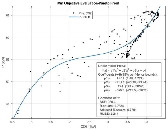 The Pareto front and the efficient solution set obtained for Power (P) and CO2 emission from multi-objective Pareto optimization of the engine performance.