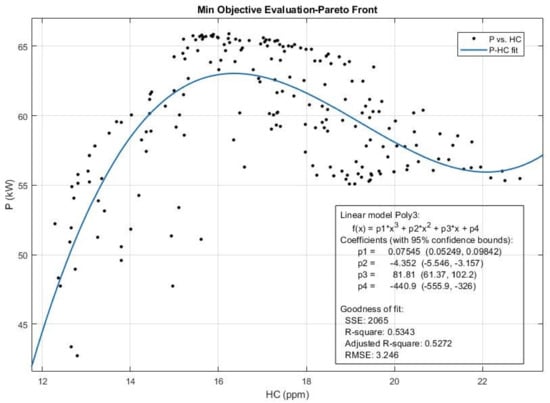 As explained in Section 2.3, a multi-objective genetic algorithm was developed in MATLAB software to find an efficient solution or an ϵ-Pareto solution that maximizes the P and T and simultaneously minimizes the CO, CO2, HC, NOX, and SFC. The input variables, their lower and upper bounds, and MOGA setup and specification were given in Table 1. The set of best solutions or efficient solutions and the corresponding Pareto front obtained using curve fitting are presented in Figure 16, Figure 17, Figure 18, Figure 19 and Figure 20; additionally, detailed results are given in Table 4. It illustrates the efficient solution and the Pareto set for the best 40 solutions, but the real Pareto front comprises 200 obtained solutions which represent the imaginary Pareto front in engine performance optimization.