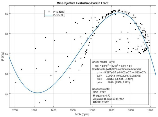 | NOx emission, NOx | p00 = −5.773 × 104 (−1.167 × 105, 1247) p10 = 95.66 (−3.035, 194.4) p01 = 3.103 (−850.8, 857) p20 = −0.05038 (−0.1053, 0.004544) p11 = −0.0391 (−0.9735, 0.8953) p02 = 0.08393 (−17.28, 17.45) p30 = 8.631 × 10−6 (−1.535 × 10−6, 1.88 × 10−5) p21 = 4.943 × 10−5 (−0.0002083, 0.0003072) p12 = −0.006094 (−0.0149, 0.00271) p03 = 0.409 (0.02081, 0.7972) | SSE: 6.14 × 104 R-square: 0.9513 Adjusted R-square: 0.9338 RMSE: 49.56 |