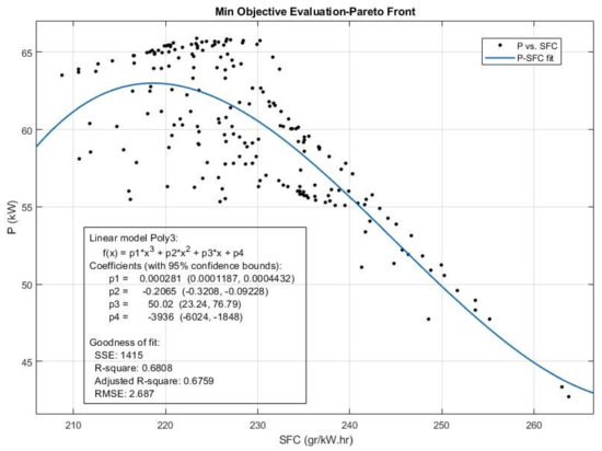 | Specific Fuel Consumption, SFC | p00 = −4625 (−1.505 × 104, 5798) p10 = 9.911 (−7.534, 27.36) p01 = −194.5 (−345.4, −43.54) p20 = −0.006563 (−0.01627, 0.003146) p11 = 0.2364 (0.07129, 0.4016) p02 = −1.839 (−4.908, 1.23) p30 = 1.415 × 10−6 (−3.815 × 10−7, 3.212 × 10−6) p21 = −6.938 × 10−5 (−0.0001149, −2.382 × 10−5) p12 = 0.0005879 (−0.0009682, 0.002144) p03 = 0.0392 (−0.02942, 0.1078) | SSE: 1918 R-square: 0.7971 Adjusted R-square: 0.724 RMSE: 8.759 |