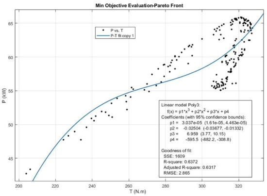 The efficient or Pareto solution obtained for engine Power (P) and Toque (T) from multi-objective Pareto optimization.