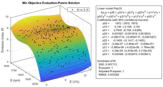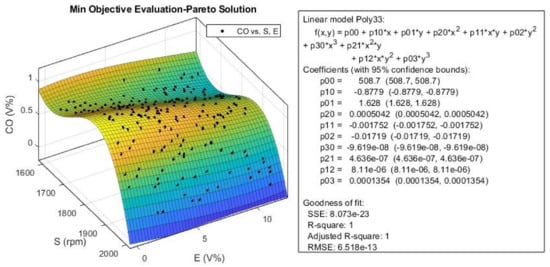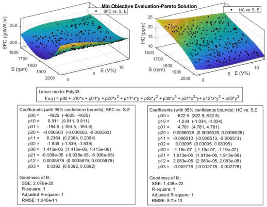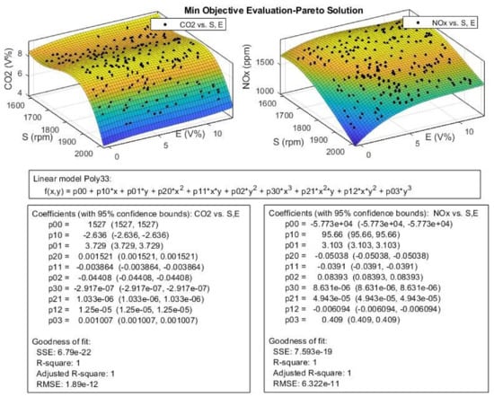 To optimize the engine performance, first, a set of objective functions were obtained using a curve fitting toolbox in MATLAB. The fitted polynomial degree was three for all output variables. Input variables are engine speed presented as S or x, and Ethanol blend ratio as E or y. The output variables or objectives were CO, CO2, HC, NOX, SFC, P, and T presented as f (x, y). These functions and their coefficients are presented in Table A1 (Appendix A) and the fitted surface can be seen in Figure 14 and Figure 15. As this table shows, all of the obtained models have an adjusted R-square of more than 0.93, except for the SFC, whose R-square value is 0.724. In multi-objective optimization, these experimental models are used as objective functions.