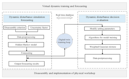 DG-HMM includes two main stages, namely the dynamic prediction and the decision evaluation. In the dynamic prediction stage, the wavelet denoising is a tool for removing noise in the data series, and then HMM is used for forecasting. When the prediction accuracy exceeds the given value, the prediction result will enter the decision evaluation stage. In the decision evaluation stage, the algorithm parameters are reset, the model is trained, then Gaussian mixture mutation is used, and finally training data are postprocessed. The predicted values that satisfy the prediction accuracy requirements will be output to physical workshop. Real-time data interaction can be carried out between dynamic prediction and decision evaluation. The data of each forecast will be automatically saved in the database so that they can be used in parameter setting and decision making for the next forecast. The prediction results of the model can provide a theoretical reference for disassembly waste generation and planning implementation. The structure of the DG-HMM dynamic prediction of disassembly waste generation is shown in Figure 1.