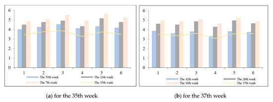 In order to verify the independence and uniform distribution, this paper conducts a correlation graph test (each simulation run 50 times) on the time series of disassembly waste generation. The results show that only 4 of the 52 values are outside the range of (α = 0.05), and there is no evidence that the negative null hypothesis is independently distributed. According to the data pattern recognition in DG-HMM, two sets of relatively close data were selected for analysis, and the results are shown in Figure 2. The abscissa in Figure 2 represents the time period (Mon., Tues., Wed., Thur., Fri., and Sat.), and the ordinate represents the amount of disassembly waste. As can be seen from Figure 2a, the data pattern for the 50th week, the 23rd week, and the 7th week is similar to that of the 35th week. Figure 2b shows that the data pattern of the 42nd week, the 26th week, and the 18th week is similar to that of the 37th week.