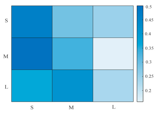 In this work, the uncertainty of disassembly waste generation was used as a hidden variable. It can be seen from Table 3 that the value of NHS is two or three, and the value of NGMC ranges from one to three. The minimum and maximum values of MLE are 306 and 397, respectively. The value of AIC ranges from −185 to −49. Regarding AIC standard, the hidden state is set to three, and the mixed component of Gaussian mixture model (GMM) is set to three, as shown in Table 3. Therefore, Uncertainty can be divided into three hidden states, namely, “S”, “M” and “L”. The initial transition probability between different hidden states can be represented by a matrix heat map. The transition matrix (A) is shown in Figure 3, and the color bar represents the transition probability of the matrix (A). The result of the chi-square test shows , which indicates that the hidden state sequence satisfies the Markov attribute.