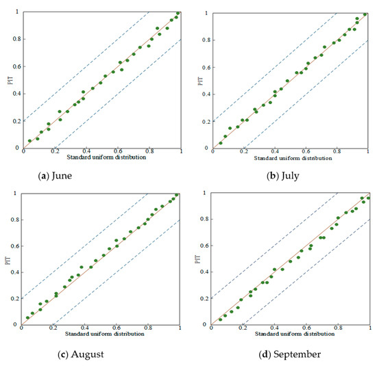 Before determining the rationality of the DG-HMM, its reliability needs to be evaluated. The PIT uniform probability plots illustrate the reliability of the observation values obtained in the monthly forecasting, as shown in Figure 4. It can be seen from Figure 4 that the predicted values of Figure 4c tend to be above the diagonal, and the predicted values of Figure 4d are concentrated below the diagonal. However, the predicted values of Figure 4a,b basically fall on the diagonal. Although the PIT values in August and September deviate slightly from the diagonal, the PIT values are very close to the diagonal. In June and July, the PIT values are within the 5% significant band of Kolmogorov. This shows that the PIT value distribution is quite uniform, and the prediction probability distribution is feasible. There is no prediction of a distribution that is too high or too low. Therefore, it can be explained that the predicted probability distribution is unbiased and with appropriate spread.