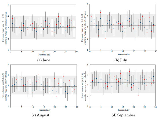 The predicted mean values based on a single observation and the (0.1, 0.9) quantile range are compared in chronological order as shown in Figure 5. The blue square and vertical line are the predicted average and the (0.10, 0.90) quantile range, respectively. The black horizontal line and the shaded area represent the predicted average value and the (0.1, 0.9) quantile range of waste generation, respectively. The red dot represents the observed data. The graph intuitively reflects the comparison between the probability prediction and the actual observation value. As far as the predicted value and the observed value are concerned, the predicted value has no obvious bias trend over time. The black vertical line or the red dot on the shading indicates that the probability prediction or observation value is not biased. It can be seen from Figure 5 that the experimental results of forecast values are very close to the observed values, and few individuals even exceed the observed values. However, the test results of Figure 5a are generally better than those of Figure 5b–d. Regarding the observed values, the fluctuations in the quantile range (0.1, 0.9) in Figure 5b,d are greater than those in Figure 5a,c. For the forecast values, compared with Figure 5a,d, the forecast values in Figure 5b,c fluctuate more greatly in the quantile range (0.1, 0.9). Based on the results of the four-months prediction, the reliability of the DG-HMM is explained.