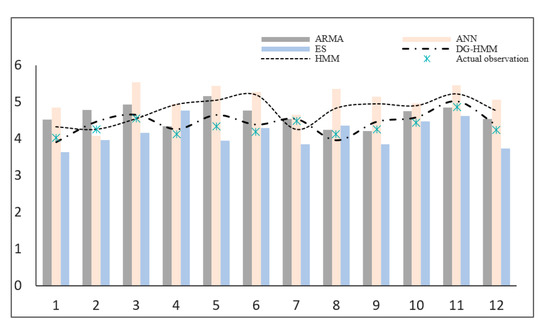 In order to further analyze the performance and comprehensive prediction capabilities of the proposed DG-HMM, the prediction results of ARMA, ES, ANN, HMM and DG-HMM were compared with actual observation data. The average value of prediction in each month was used as the forecast, and the comparison results are shown in Figure 7. As for the overall trend in Figure 7, the prediction average values of EA are undoubtedly lower than the actual observed values, but the predicted values of ANN and HMM are higher than the observed values. Obviously, the predicted values of DG-HMM and ARMA are closer to the observed values. The predicted trends of HMM and DG-HMM are very similar to actual observation, but the values of DG-HMM are closer to the observed values. Although ARMA, ES and ANN have large errors with the observed values, the overall trend is still very close. The MAE, R2, and Ȓ2 of the prediction results for the five models are shown in Table 4. For MAE, the highest value is ANN (20.47), and the lowest value is DG-HMM (14.35). Regarding R2, DG-HMM (0.913) and ARMA (0.875) are the highest value and the lowest value, respectively. For Ȓ2, ARMA has a minimum value of 0.861 and DG-HMM shows a maximum value of 0.911. For the variance improvement rate in the models, the maximum improvement rate of ANN is 1.60%, and the minimum improvement rate of DG-HMM is 0.22%, which shows that DG-HMM has the best stability among other models. The MAE, R2, and Ȓ2 values of DG-HMM are significantly better than the other four models, especially for the criterion of MAE. The analysis results show that DG-HMM performs better predictability than ARMA, ES, ANN and HMM.