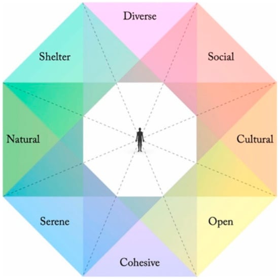 The Supportive Environment Theory (SET) states that specific qualities of green environments are supportive of psychological restoration [,]. These qualities correspond to different human needs for support, including the needs for rest, exercise, socialising, or pleasure. SET explains the relationships among the individual’s mental strength, the need for supportive environments, and the PSDs []. This theoretical framework has been suggested as a cornerstone for the evaluation and design of green areas [,].