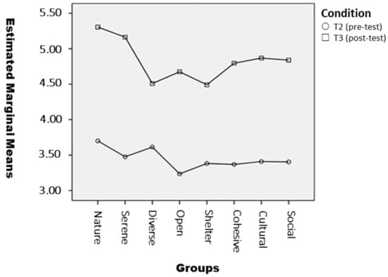 The Box’s M value of 57.61 was associated with a p value of 0.106, p < 0.005, which is interpreted as non-significant []. Therefore, the covariance matrices among eight groups are assumed to be equal for the purposes of the Repeated Measures. Consequently, although the groups were independent, it is possible to compare them with each other. In addition, Levene’s test indicated equal variances of dependent variable (Restorative State) among eight groups for T2 (pre-test, F = 1.571, p = 0.148), and T3 (post-test, F = 1.095, p = 0.369).