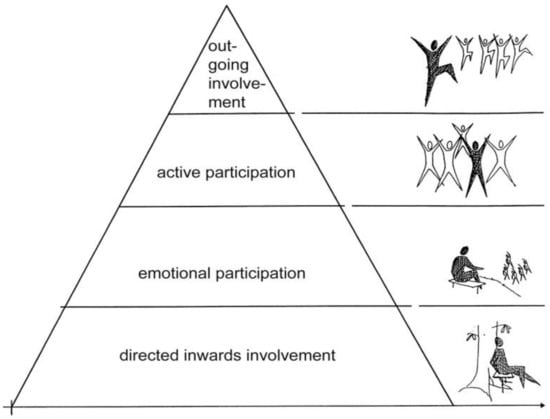 The relationship between the need for support and mental strength is usually illustrated as a hierarchy of needs (see Figure 3). The X-axis illustrates the need for support, while the Y-axis illustrates the person’s mental strength. The figure also includes four levels, which reflect the needs for support the person experiences []. This model has been tested and developed in several studies, for example, at the Alnarp rehabilitation garden, in which participants were severely stressed or ill [,].