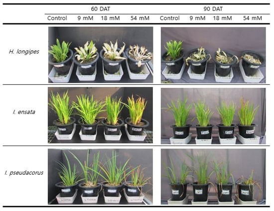 Hosta longipes began to show light leaf blight symptoms at 10 days after CaCl2 treatment. At 60 DAT, dry leaf tips or spots in the 9 mM group and leaf blight symptoms in the 18 mM group were clearly observed, but plants in the 54 mM group almost withered. At 90 DAT, there was severe damage in all CaCl2 treatment plots except for the control, resulting in near death (Figure 1). Iris ensata did not show any damage at 30 DAT, although slight browning was observed in the 54 mM group from 33 DAT. At 60 DAT, in the 54 mM group, slight browning continued at the tip of the plant. A similar trend was observed at 90 DAT. Iris pseudacorus showed slight browning at the tips of leaves in the 54 mM group from 24 DAT. At 60 DAT, the browning appeared in the 9 mM and 18 mM groups. Visually significant damage appeared in the 54 mM group. Plants in the 9 mM and 18 mM groups at 90 DAT showed results similar to those at 60 DAT. However, in the 54 mM group, more than half the leaves dried up and almost all leaves withered at 90 DAT, whereas relatively few parts of Iris ensata withered in the 54mM group at 90 DAT.