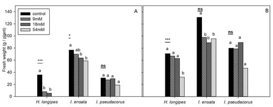 By measuring fresh weights of shoots and roots after the experiment, we found that shoots were more sensitive to CaCl2 treatment than roots (Figure 2). Fresh weights of shoots of Hosta longipes were significantly different (p < 0.001) between control and CaCl2 treatment plots. There was no significant difference in fresh shoot weight between the 9 mM and 18 mM groups. Shoot measurement for the 54 mM group was impossible, because they were completely dead. There was no significant difference in fresh root weight among control, 9 mM, and 18 mM plots. In the 54 mM group, shoots withered, showing relatively low root weights. Fresh shoot weights of Iris ensata decreased significantly (p < 0.05) with increasing treatment concentrations (0, 9 mM, 18 mM, and 54 mM) of CaCl2. Weights of fresh shoots and roots of Iris pseudacorus were not significantly different between control and CaCl2 treatment plots. For root measurements of Iris ensata and Iris pseudacorus, there were significant differences by plots. Although there were differences in average weights, such differences were insignificant. Hooks and Niu [] have studied salt (NaCl) tolerance of four types of perennial ornamental herbaceous plants. By measuring weights of shoots and roots, they found that shoots were more sensitive to salt than were roots. Munns and Tester [] have also reported that shoots are more sensitive to salt than roots are. In the present study, growth of shoots and roots for all plants showed similar relative decreases, identical to the results of a previous study.