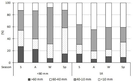 The percent share of particle size fractions within the <80 mm fraction and in SR in each season of collection.