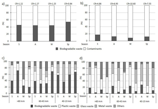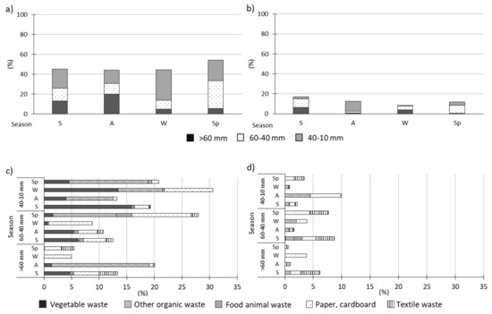 Figure 2 shows the percentage share of only biodegradable waste in particle size fractions (except <10 mm) (Figure 2a,b) and composition of biodegradable waste of the <80 mm and SR depending on collection season (Figure 2c,d). It was considered that the biodegradable waste in samples from the <80 mm fraction and SR included vegetable waste, other organic waste, food animal waste, paper and cardboard waste, and also textile material. The share of biodegradable waste in the <80 mm fraction and SR in the three particle size fractions changed depending on the collection season. The biodegradable waste in the <80 mm fraction ranged from 44.1% (A) to 54.3% (Sp), whereas in the SR fraction it ranged from 8.5% (W) to 17.1% (S) (Figure 2a,b).