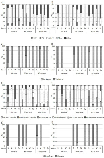Figure 4 presents the composition of the four main groups of contaminants, in particle size fractions separated from the <80 mm fraction and SR depending on the season. The content of a particular contaminant was assumed to be 100%.