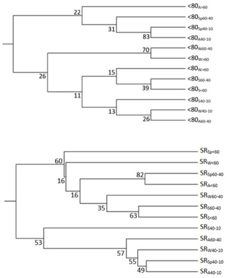 Hierarchical clustering based on Nei-Li distances was used to examine the similarities of the composition in particle size fractions separated from the <80 mm fraction and SR (Figure 5). In the case of both the <80 mm fraction and SR, two main clusters were distinguished.