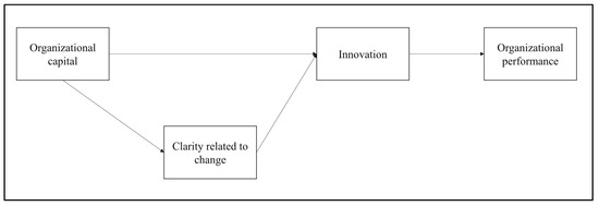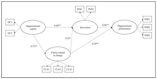Second, the structural model (Model 1, Figure 1) was tested by using the structural equation modeling (SEM) approach [55]. The model was conceptualized using OC, clarity related to change, innovation, and organizational performance. Following our hypotheses, we tested both direct and indirect (through clarity about change) effects of OC on innovation. Furthermore, we tested the clarity related to change–innovation relationship, and through it, its relationship with organizational performance.