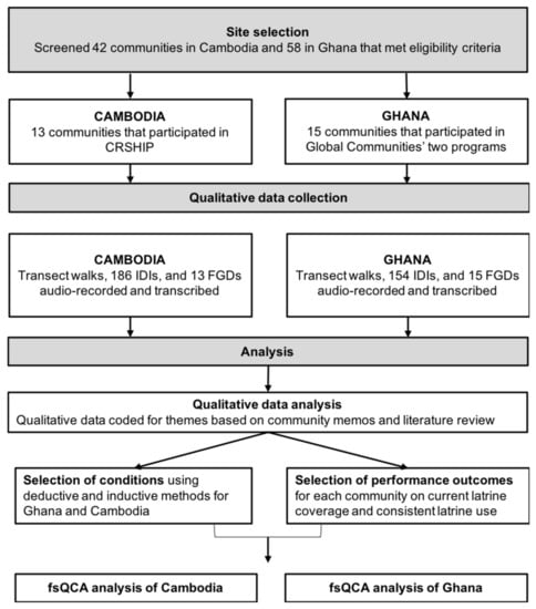 Our study goals were to understand and compare the local conditions that influence sustained latrine coverage and consistent use in communities that participated in CTLS programs in Cambodia and Ghana. We analyzed conditions under three categories of interest: (i) engagement of community leaders, (ii) post-triggering and post-ODF follow-up, and (iii) financial and pro-poor support. By using fsQCA, we identified how combinations of conditions influenced outcomes, allowing us to better understand how the actors at the community level worked in concert. By comparing the countries, we aimed to draw conclusions on how mechanisms for sanitation uptake vary in different settings.