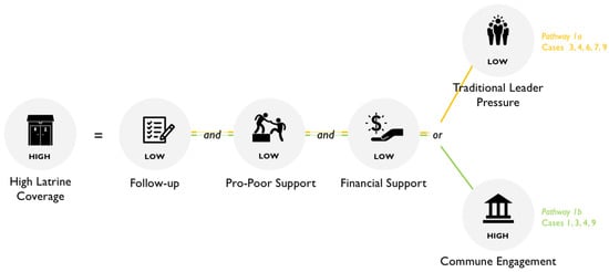 Pathways for high latrine coverage in Cambodia. Using fsQCA, we identified two pathways for achieving the outcome of high latrine coverage in Cambodia. Both pathways included the conditions of low follow-up, low pro-poor support, and low financial support. Pathway 1a also included low pressure from traditional leaders, and pathway 1b included high commune engagement.