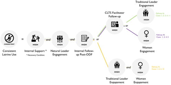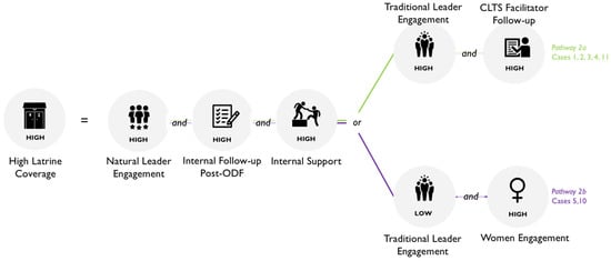 Pathways for high latrine coverage in Ghana. Using fsQCA, we identified two pathways for achieving the outcome of high latrine coverage in Ghana. Both pathways included the conditions of high natural leader engagement, high internal follow-up post ODF, and high internal support. Pathway 2a also included engaged traditional leaders and high CLTS facilitator follow-up, while pathway 2b included the combination of inactive traditional leaders and high engagement of women.