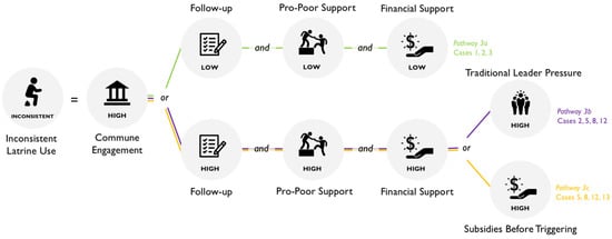 Pathway for inconsistent latrine use in Cambodia. Using fsQCA, we identified three pathways for achieving the outcome of inconsistent latrine use in Cambodia. All pathways included the condition of high commune engagement. Pathway 3a also included low follow-up, low pro-poor support, and low financial support. Pathways 3b and 3c both included the conditions of high follow-up, high pro-poor support, high financial support, and either high traditional leader pressure (3b) or subsidies before triggering (3c).