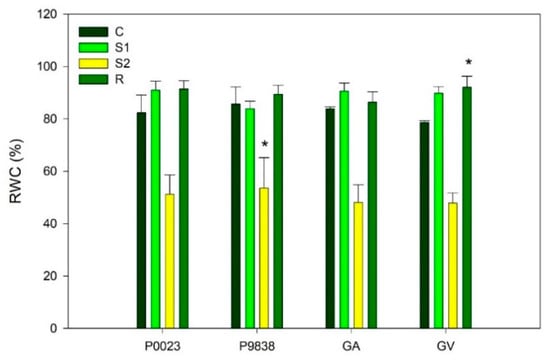 Leaf relative water content of all studied genotypes in the different conditions (mean ± standard deviation; n = 10). Well-watered plants (C); plants stressed for 7 (S1) and 12 (S2) days; rewatered plants (R). Asterisks indicate significant differences between drought conditions and control group (p ≤ 0.05).