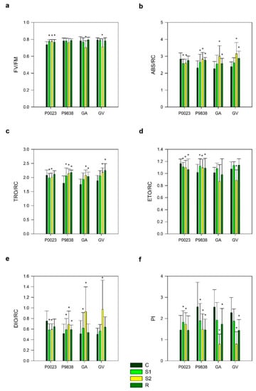 In control plants (C) P0023 presented a lower Fv/Fm and PI and a higher TRO/RC and DIO/RC than the other genotypes. However, during the initial phase of stress (S1), photochemical parameters converged and significant differences between genotypes were almost absent (Figure 2). With the progress of stress conditions (S2) differences between the genotypes reappeared. GA and GV presented a lower Fv/Fm, PI, and ETO/RC than the commercial genotypes. Except for FV/Fm on P9838 and Eto/RC in GA, all fluorescence parameters departed significantly from the control value in S1 and/or S2 (p < 0.05).