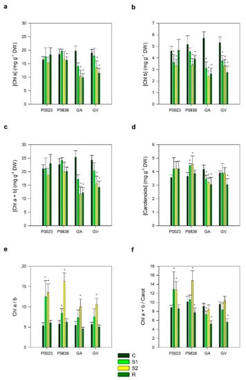 A similar, albeit more complicated trend was observed in total carotenoids (Figure 3d). In fact, no changes in total carotenoids content were observed in P0023, but in P9838, an increase was even observed in S1 and S2 in relation to C, albeit at R the value decreased to near the control (p < 0.05). Between the Guinea-Bissau lines some differences were also recorded: whereas in GA a decrease in total carotenoids content was observed in all treatments in relation to C, in GV, the carotenoids content was only lower at R than at C. In the Pioneer genotypes, the ratio Chl. a/b increased in relation to C at S1 and at S2, but such an increase was observed on the Guinea-Bissau genotypes only at S2 (p < 0.05) (Figure 3e). In addition, the ratio Chl. a+b/carot increased with stress in relation to C in the Pioneer genotypes (except in S1 for P9838), but was unchanged in the African genotypes (except for GA at S1) (p < 0.05) (Figure 3f).