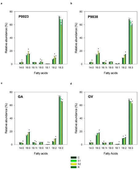 Fatty acids profiles of maize plants subjected to drought stress and rewatered. (a) P0023; (b) P9838; (c) GA; (d) GV. Myristic acid (C14:0), palmitic acid (C16:0), trans-hexadecanoic acid (16:1t), stearic acid (C18:0), oleic acid (C18:1); linoleic acid (C18:2), and α-linolenic acid (C18:3). Well-watered plants (C); plants stressed for 7 (S1) and 12 (S2) days; rewatered plants (R). Values correspond to mean ± standard deviation (n = 3-4); asterisks indicate significant differences between drought conditions and control group (p ≤ 0.05).