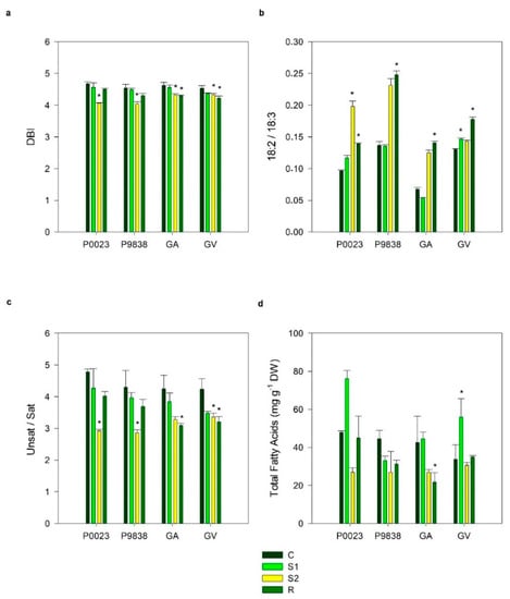In the four genotypes studied, the drought treatment S2 resulted in a reduction in C18:3 relative amounts and the opposite occurred for C16:0 (Figure 5a–d). Rewatering reversed this effect in P0023 and partially in P9838 (only for C16:0), but not for the other two genotypes. The reduction of C18:3 was accompanied by an increase in its biosynthetic precursor, C18:2, for all the genotypes after rewatering, for GV at S1, and for P0023 at S2. These drought-induced alterations in the relative amounts of the two polyunsaturated FAs resulted in a general trend for an increase in the C18:2/C18:3 ratios (Figure 5b). The levels of the saturated C18:0 were also higher in the S1 and S2 samples of P0023, as well as the R leaves of P9838. S2 also caused increases of C14:0 S2 in P0023, P9838, and GV, whereas an increase during recovery was observed in GA. Concerning the C16:1t amount, an early reduction (S1) was seen in GV, and in GA, this FA was less abundant in S2 and R. Although in P9838 the C16:1t content was lower during R, no changes were observed in P0023 in any of the samples analyzed. All these changes in the FA profiles resulted in lower double bond indexes (DBI), and lower ratio of unsaturated to saturated (Unsat/Sat) for all the genotypes at S2, and only P0023 and P9838 were able to present values similar to controls after rewatering (Figure 5a,c).