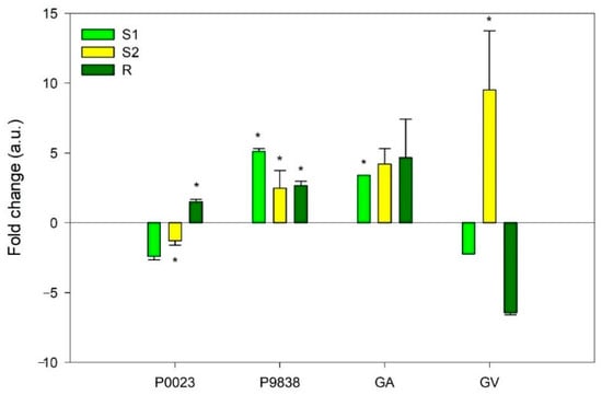 In S2, PLD remained downregulated in P0023, while in the other three genotypes it was upregulated. During the recovery period, P0023, P9838, and GA presented an upregulation of PLD, while in GV, this gene was negatively modulated (Figure 6).
